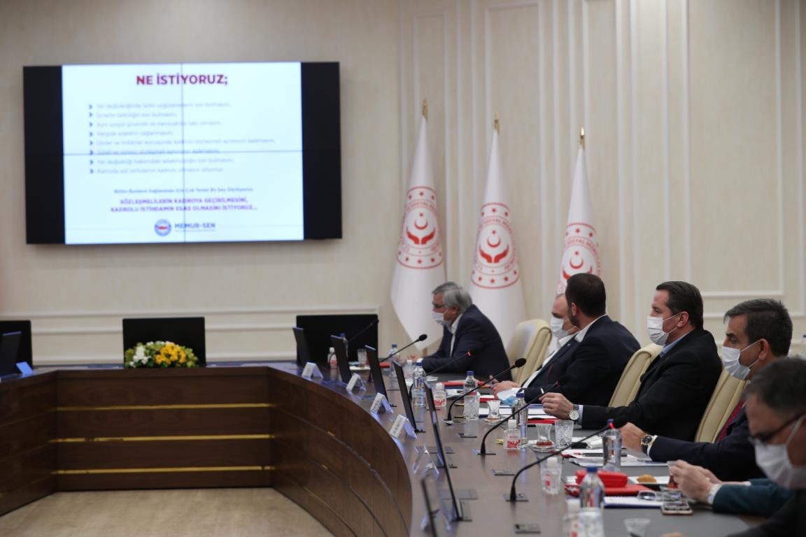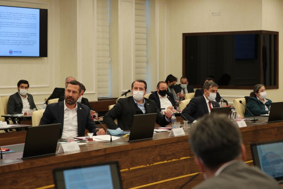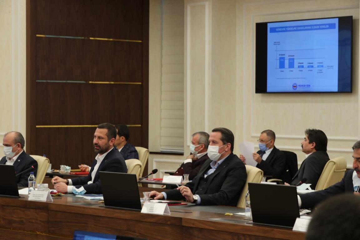 "Sözleşmeli personel" ile "Görevde yükselme ve unvan değişikliği" başlıklı gündem maddelerinin ele alındığı toplantıda, Memur-Sen Genel Başkanı Ali Yalçın, sözleşmeli personel istihdamına dair sorunlar ve kadro talebine ilişkin değerlendirme yanında, görevde yükselme ve unvan değişikliği konusunda kurumların uygulamaları arasındaki farklılığı, personelin beklentileri ile sınavların periyodik bir düzende yapılması talebini ifade etti.
