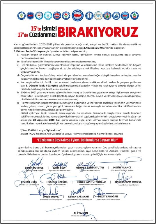 dikkat çekmek, tepki vermek, kamuoyunda bu noktada farkındalık oluşturmak, emek tarafının tekliflerine ve tepkilerine kamu görevlilerinin ve farklı toplum kesimlerinin destek vermesini sağlamak amacıyla 20 Ağustos 2019 Salı günü Ankara iliyle sınırlı olmak üzere bütün hizmet kollarında sendikalarımızın katkıları ve ilgili kurum ve kuruluşlarda görev yapan üyelerimizin katılımıyla; Saat 15:00 itibarıyla “iş bırakma”, Saat 17:00 itibarıyla Aile Çalışma ve Sosyal Hizmetler Bakanlığı hizmet binası önünde “Boş Kalırsa Eylem, Doldurulursa Bayram” eylemleri ve buna dair basın açıklamaları yapılmasına, eylem kararının üye sendikalara duyurulmasına, sendikalarca bu noktada eylem kararı alınmasına, üye sendikaların Ankara ilindeki şube ve temsilciliklerine ve bunlar üzerinden üyelere duyurulmasına oy birliğiyle karar vermiştir.