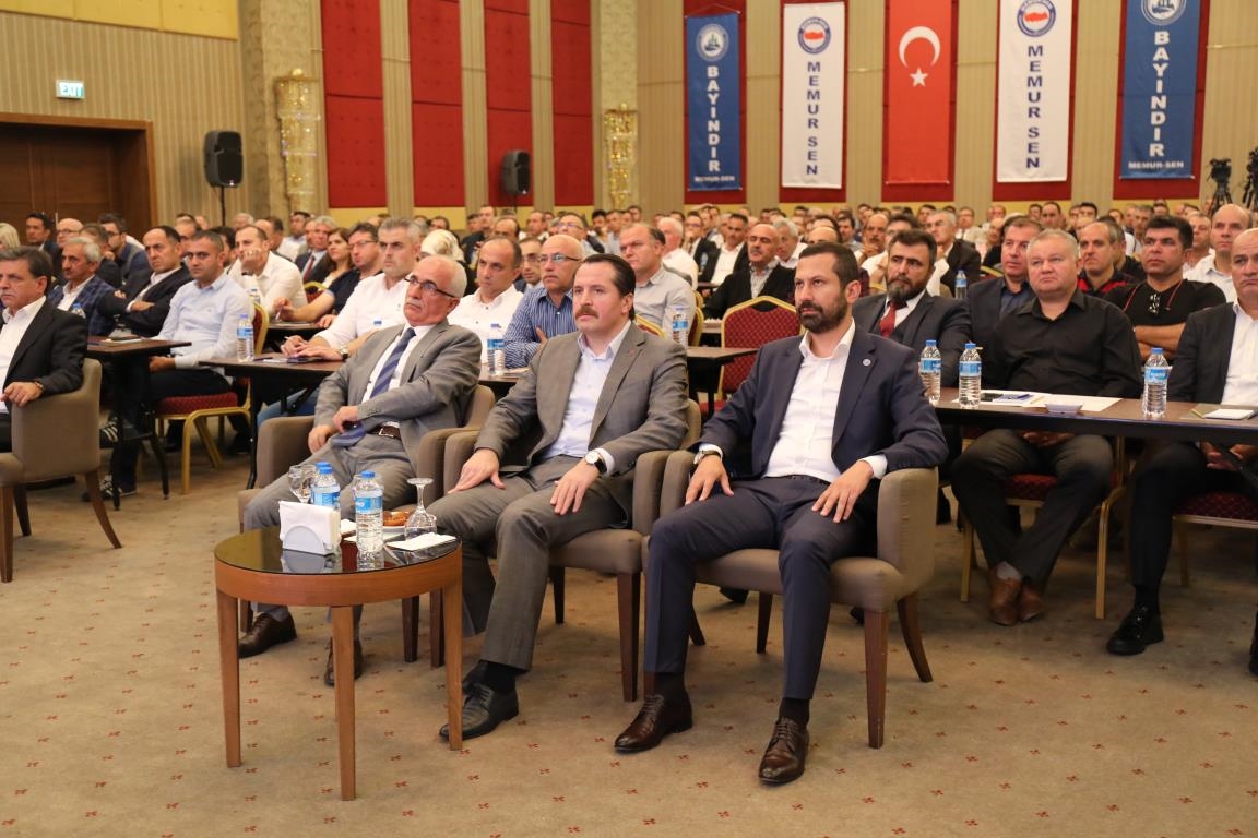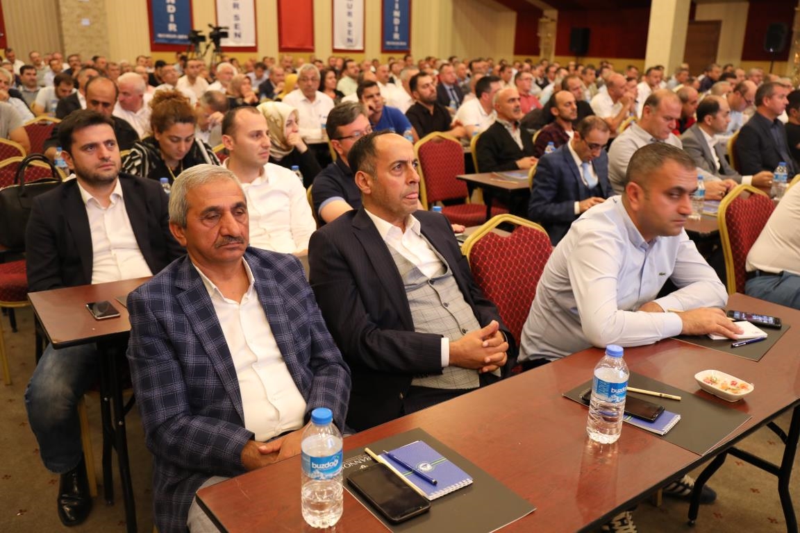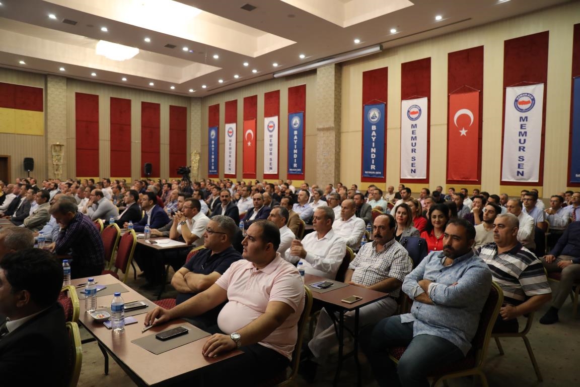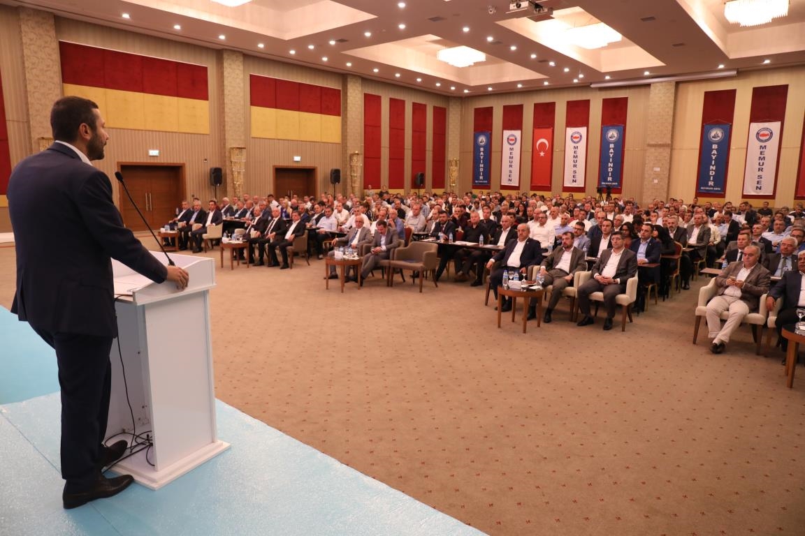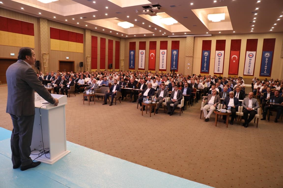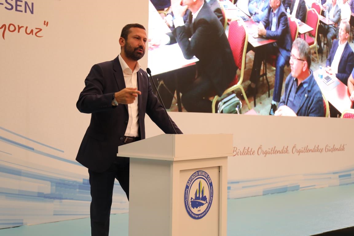 Konuşmalarını sürdüren Yalçın, ‘’5. Dönem Toplu Sözleşme sürecinde iş bırakma eylemi yaptık. Ardından boş cüzdanlarımızı Bakanlığın önüne koyduk. Bizim derdimiz bağcıyı kovmak değil, üzüm yemektir. Refahtan pay almaktır. Kamu İşveren Heyeti müzakerede uzlaştı, tutanakta şaştı. Uzlaşmadan ve paylaşımdan kaçınan bir işveren tavrıyla karşılaştık. Kamu işvereni kazandıracak teklif sunmadı, biz de kazandırmayan teklife imza atmadık. Çünkü biz omuzlarımızda 1 milyonu aşkın üyenin haysiyetini, 5 milyon 200 bin kişinin mesuliyetini taşıyoruz. Mesuliyeti yerine getirdik, haysiyeti çiğnetmedik” dedi.