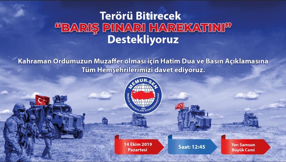 14.10.2019 Pazartesi günü Saat 12.45’te Samsun Büyük Camii önünde Terörü Bitirecek “ BARIŞ PINARI HAREKATI” destek için basın açıklamamıza ve Şanlı Ordumuzun Muzaffer olması için Hatim Dua Programımıza DAVET EDİYORUZ. Gün sessiz kalma değil, milli birlik ruhuyla, bir ve beraber olarak ses verme günüdür.